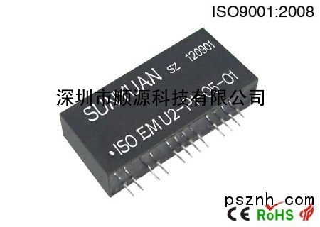 SunYuan ISO EM U-P-O-O电压输入系列和ISO EM A-P-O-O电流输入系列1进2出低成本小体积IC封装的模拟量隔离变送器隔离放大器 ,是一种将(传感器输出)单路模拟电压或电流信号经隔离、分配、转换成两路精度、线性度相匹配的标准模拟信号的混合集成电路。该IC在同一芯片上集成了高隔离的DC/DC分布电源和多组磁电耦合的模拟信号隔离放大器,采用磁电偶合的低成本方案,主要用于对EMC(电磁干扰)无特殊要求的场合。输入及输出侧宽爬电距离及内部隔离措施使该芯片可达到电源、信号输入、两路信号输出的3KVDC,四隔离。ISO EM系列单信号输入双输出隔离变送器IC产品使用非常方便,免零点调节,只需外接增益调节电位器,即可实现工业现场各种传感器信号的隔离、分配、转换功能,并能满足工业级宽温度、潮湿、震动等恶劣工作环境要求。